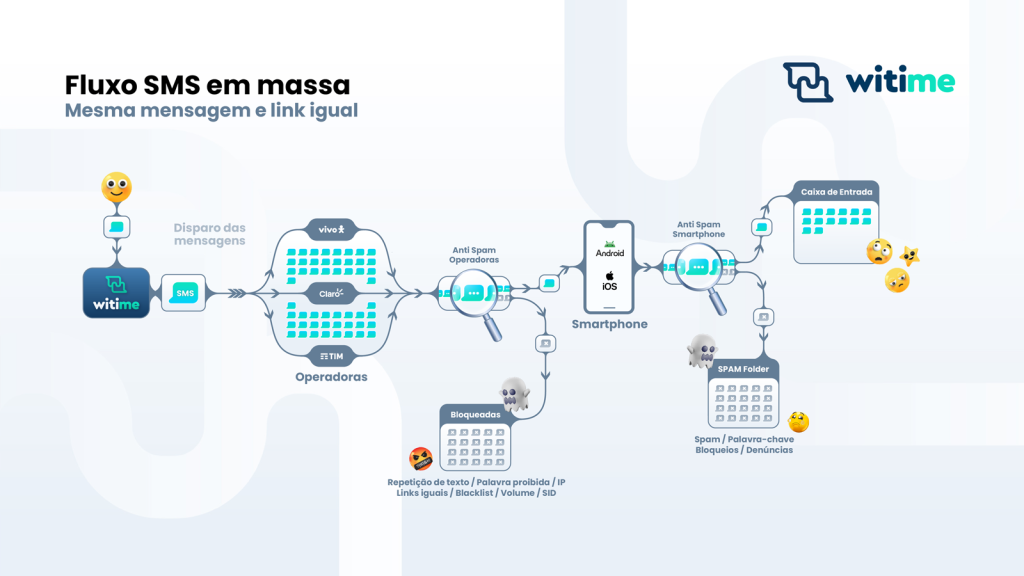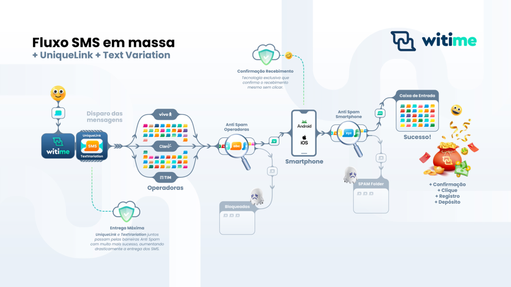 A tecnologia Text Variation da Witime resolve o problema do bloqueio por repetição. Em vez de um conteúdo estático, o sistema altera automaticamente a estrutura das frases e utiliza variações de palavras para cada destinatário. Isso garante que cada SMS seja visto como uma peça individual e legítima pelos sistemas de segurança das operadoras e dos fabricantes.